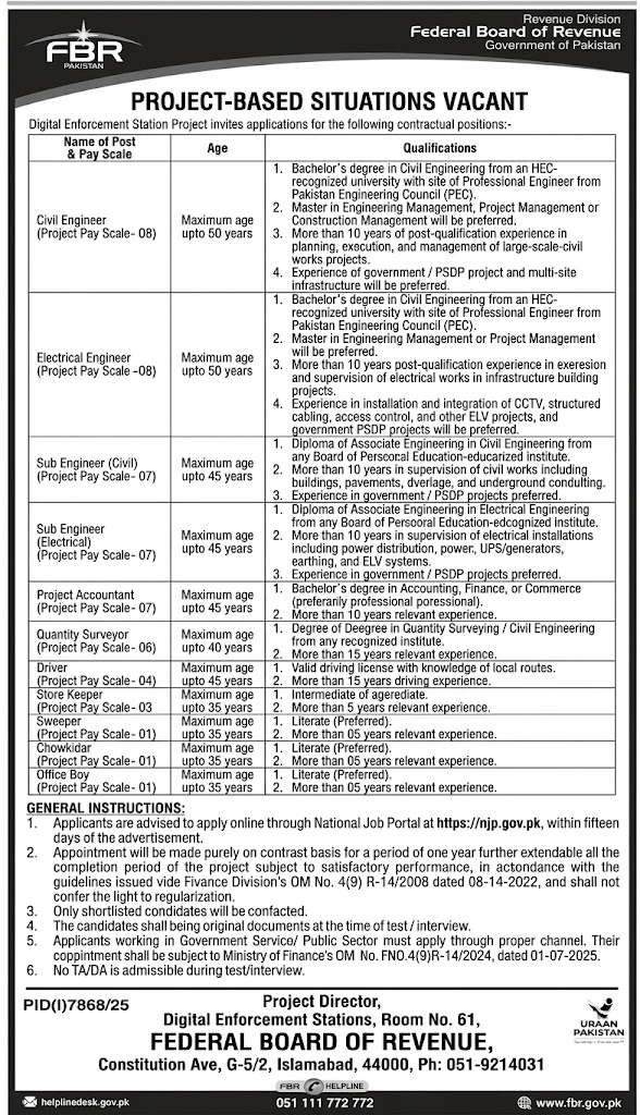 The FBR Jobs 2026 have officially been announced by the Federal Board of Revenue under its Digital Enforcement Stations initiative. These vacancies are offered on a project-based contract for candidates with qualifications in fields such as engineering, finance, and various support services, along with opportunities similar to Pakistan airline jobs.